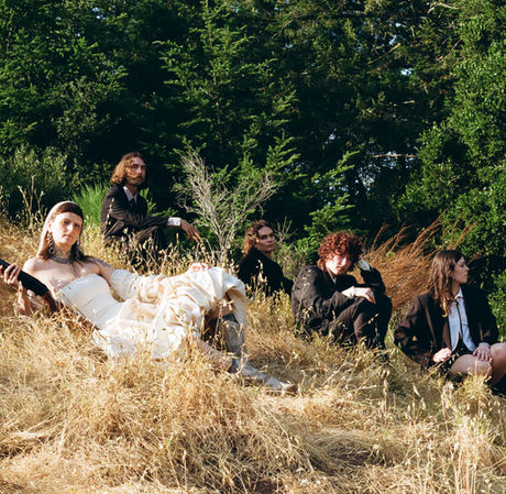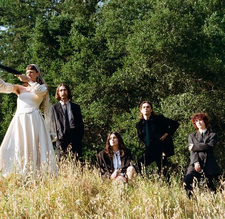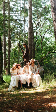 Promotional material for Slake's latest release - Let's Get Married - featuring the band as: bride/grooms of an eclectic gay wedding while simultaneously being the sister wives in attendance, too, on Kodak Gold.